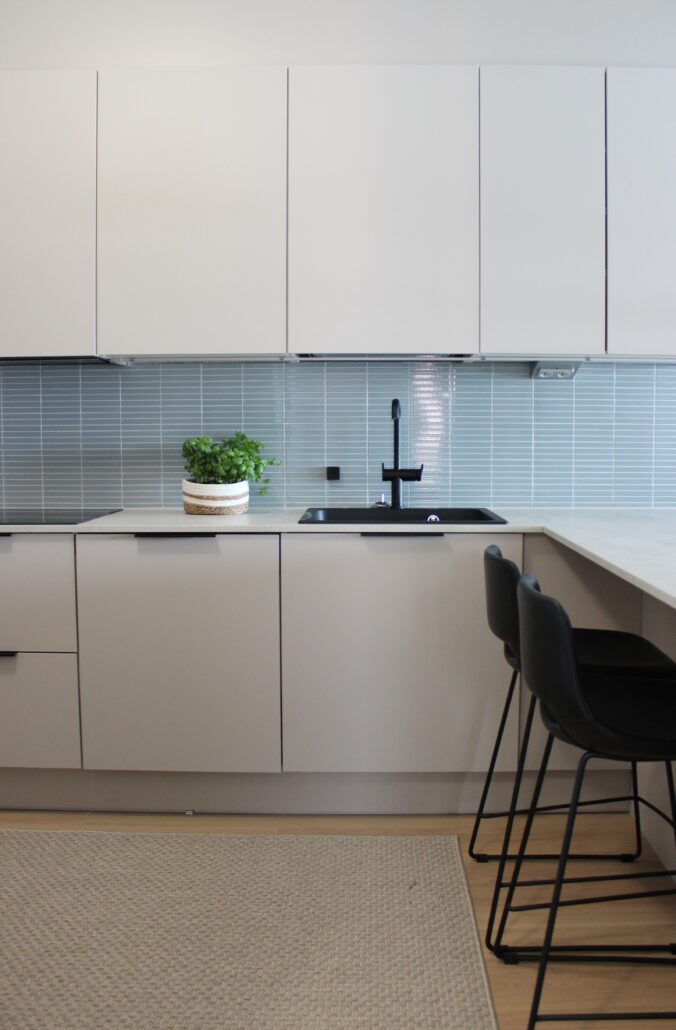 Kahdelle aikuiselle remontoitiin kaupunkikoti veden äärelle. Veden sävyt tuotiin myös sisätiloihin ja pehmennyksenä mukaan tammea ja pellavan sävyjä, ripaus mustaa tuomaan särmää.